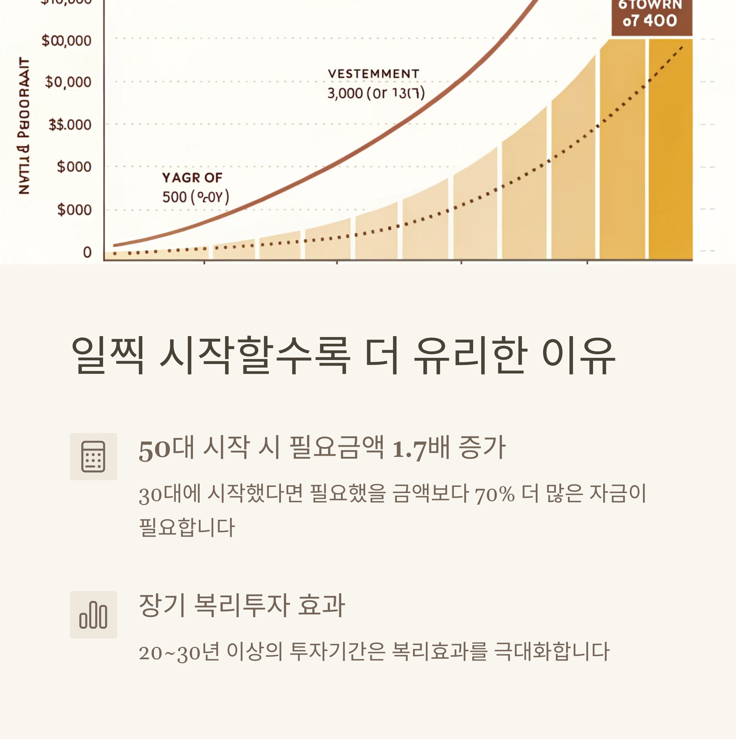 은퇴 후 안정적인 생활을 위한 자금 준비는 가능한 빨리 시작할수록 유리합니다. 이유는 복리 효과 덕분입니다. 적은 금액이라도 일찍 시작하여 시간이 지나면서 자산이 증식하는 효과를 기대할 수 있기 때문입니다. 반대로 준비가 늦으면 늦을수록 준비해야 할 금액이 커지고, 시간적 여유도 부족해집니다.