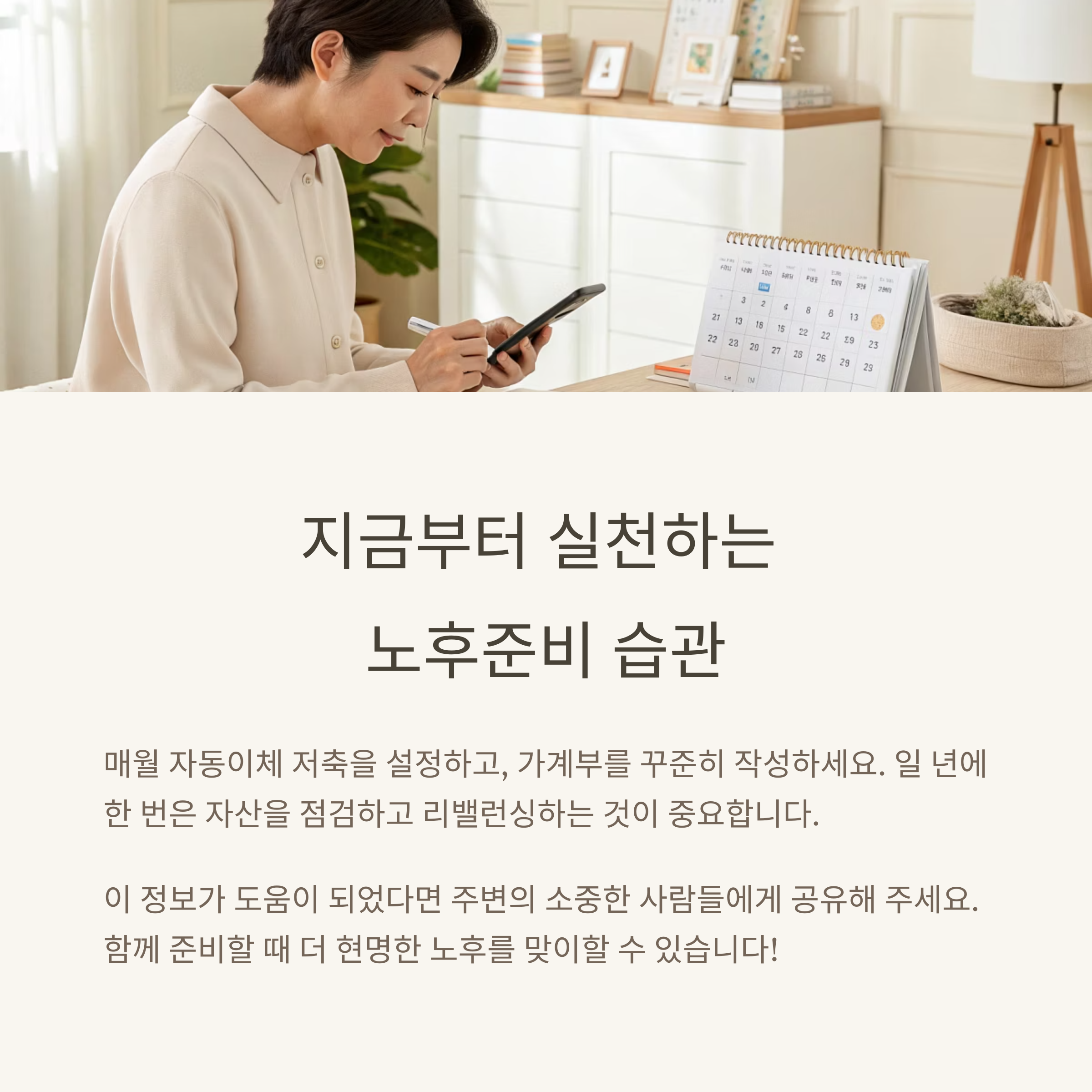 은퇴 후 경제적 안정을 위해서 생활 자금을 준비하는 일은 더 이상 미룰 수 없는 중요한 과제입니다. 시간은 누구에게나 공평하게 흐르지만, 은퇴 후 필요한 자금을 준비하는 것은 결국 '지금 시작해야 할 이유'를 찾는 것에서부터 시작됩니다. 은퇴 시점에서 경제적 어려움을 겪지 않도록, 현재부터 준비하는 것이 중요합니다.