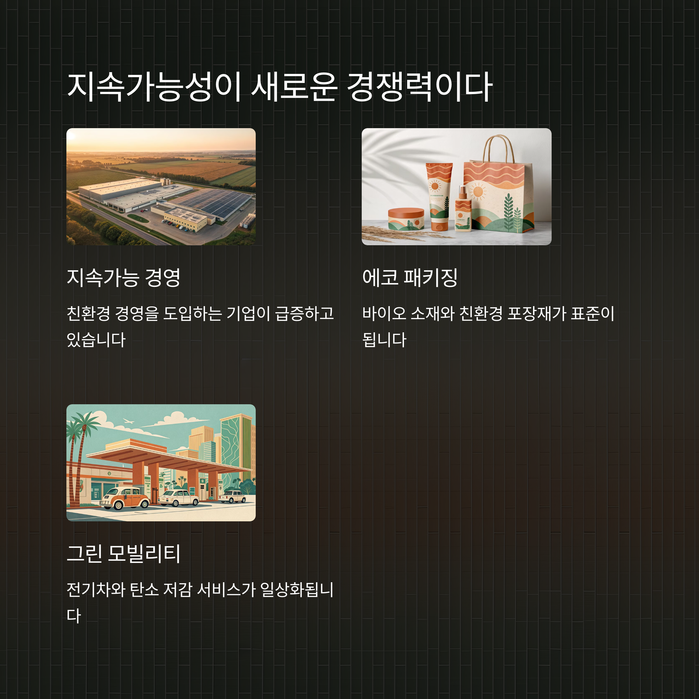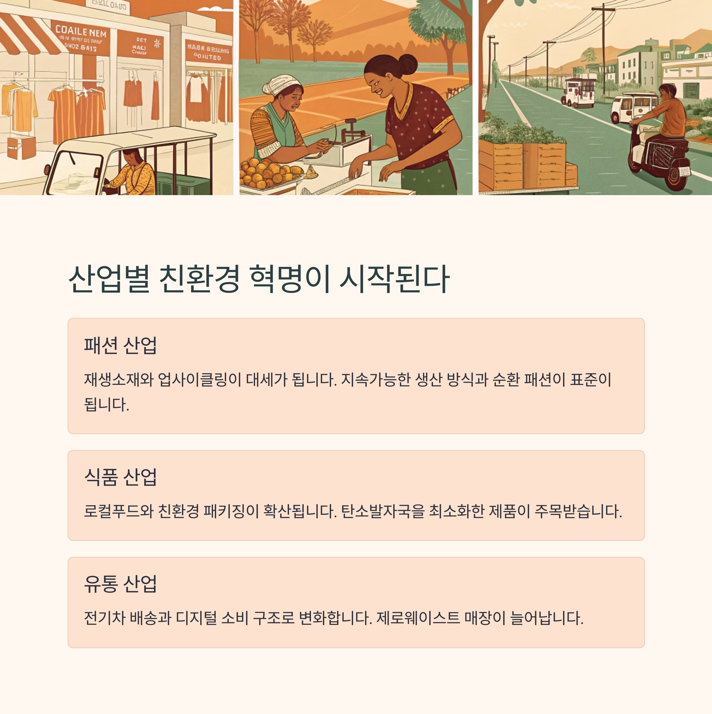 패션 산업은 지속 가능한 의류와 친환경 소재로 변화를 맞이하고 있으며, 식품 산업에서는 유기농 제품과 환경 친화적 포장이 주목받고 있습니다.