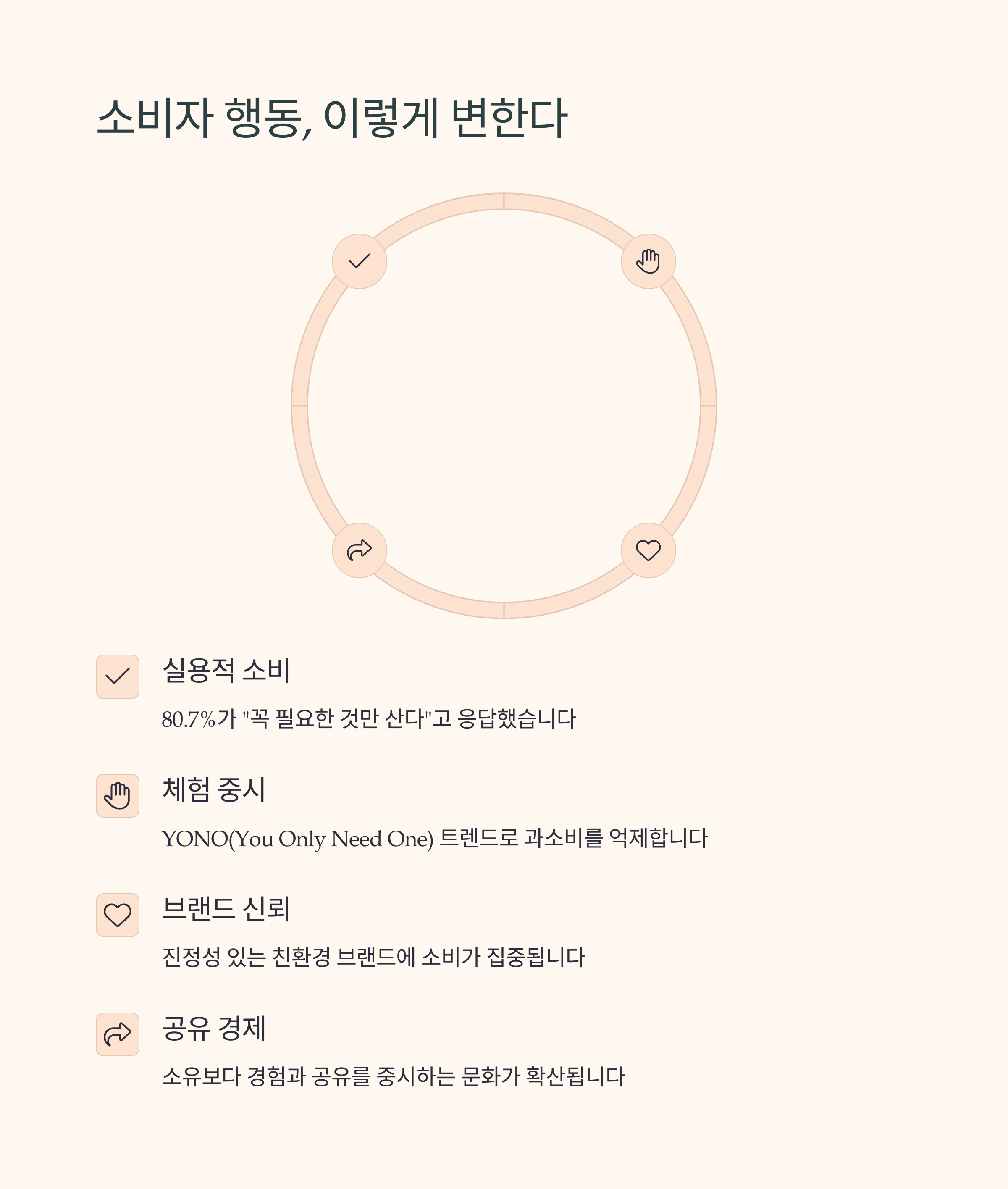 과거에는 친환경 소비가 가격이 비싸거나 불편하다는 인식이 있었지만, 최근에는 이러한 요소들이 품질편리함을 동시에 만족시키는 방향으로 변화하고 있습니다.