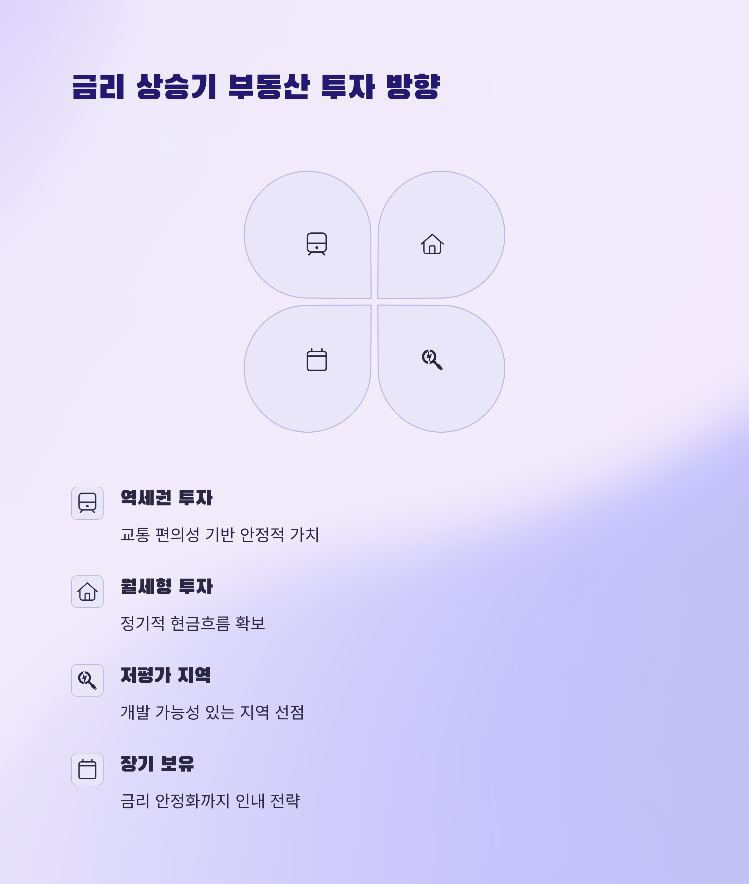 금리가 상승하는 상황에서는 부동산 투자 전략을 재조정해야 합니다. 금리가 오르면, 대출 이용자의 부담이 커지고 주택 수요가 줄어들 수 있기 때문에, 투자 전략에 신중을 기해야 합니다. 예를 들어, 저금리 시기에 대출을 받아 부동산을 구매한 사람들은 이자 부담이 커지므로 매도 시점도 중요한 전략이 될 수 있습니다. 반면, 금리가 상승하면 구매력이 낮아져 저가 매물을 찾는 기회가 될 수도 있습니다.