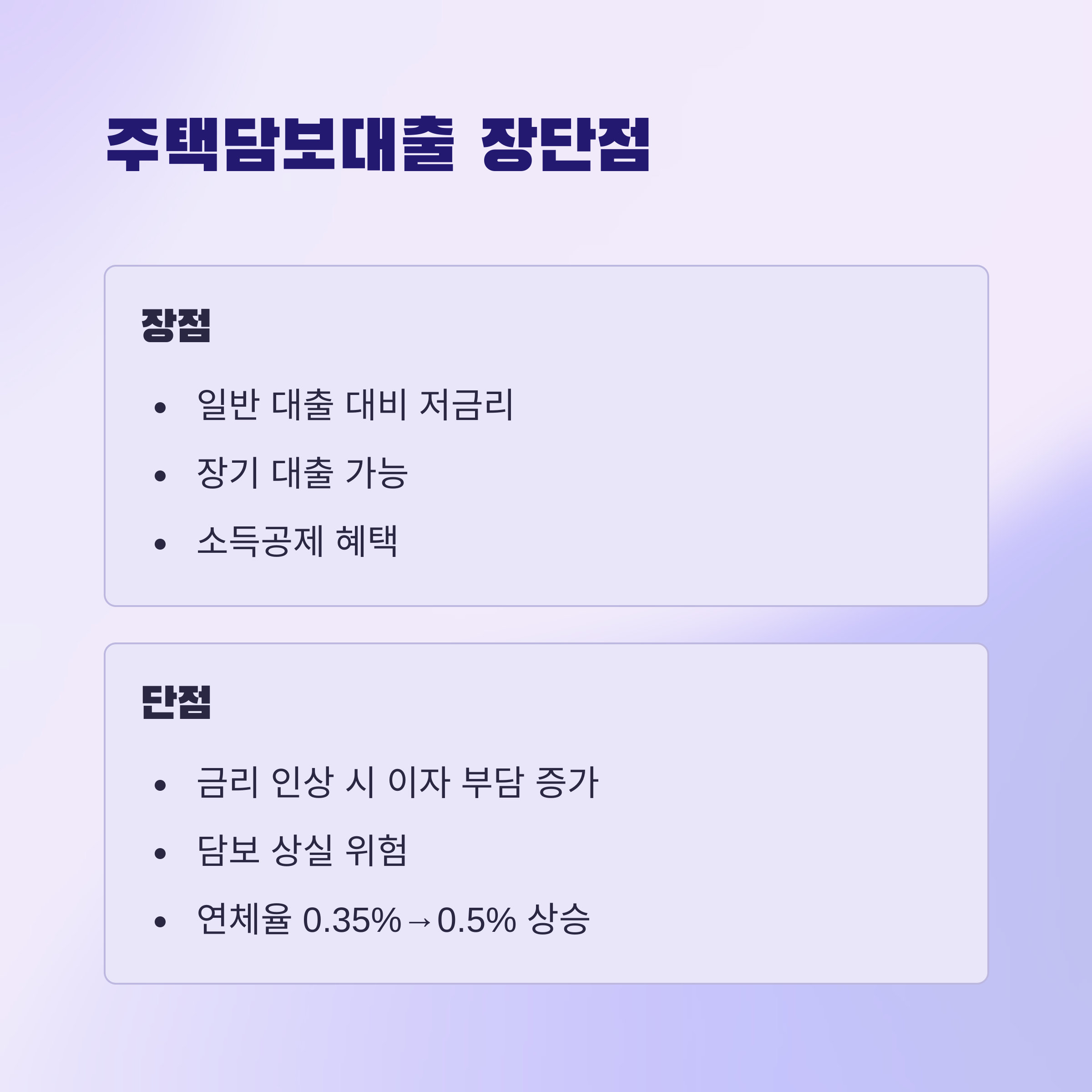 주택 담보 대출의 장점은 저금리 대출을 통해 자금을 마련하고, 주택을 구매할 수 있다는 점입니다. 하지만 금리가 상승하면 이자 부담이 커져 대출 상환에 어려움을 겪을 수 있습니다. 금리가 오르면 대출자의 월 상환액이 증가하고, 이는 가계 부담으로 작용할 수 있습니다. 특히 고정 금리 대출을 선택하지 않은 경우, 금리 인상으로 인해 상환 계획이 어려워질 수 있습니다. 금리 상승기의 리스크를 충분히 고려한 대출 전략이 필요합니다.