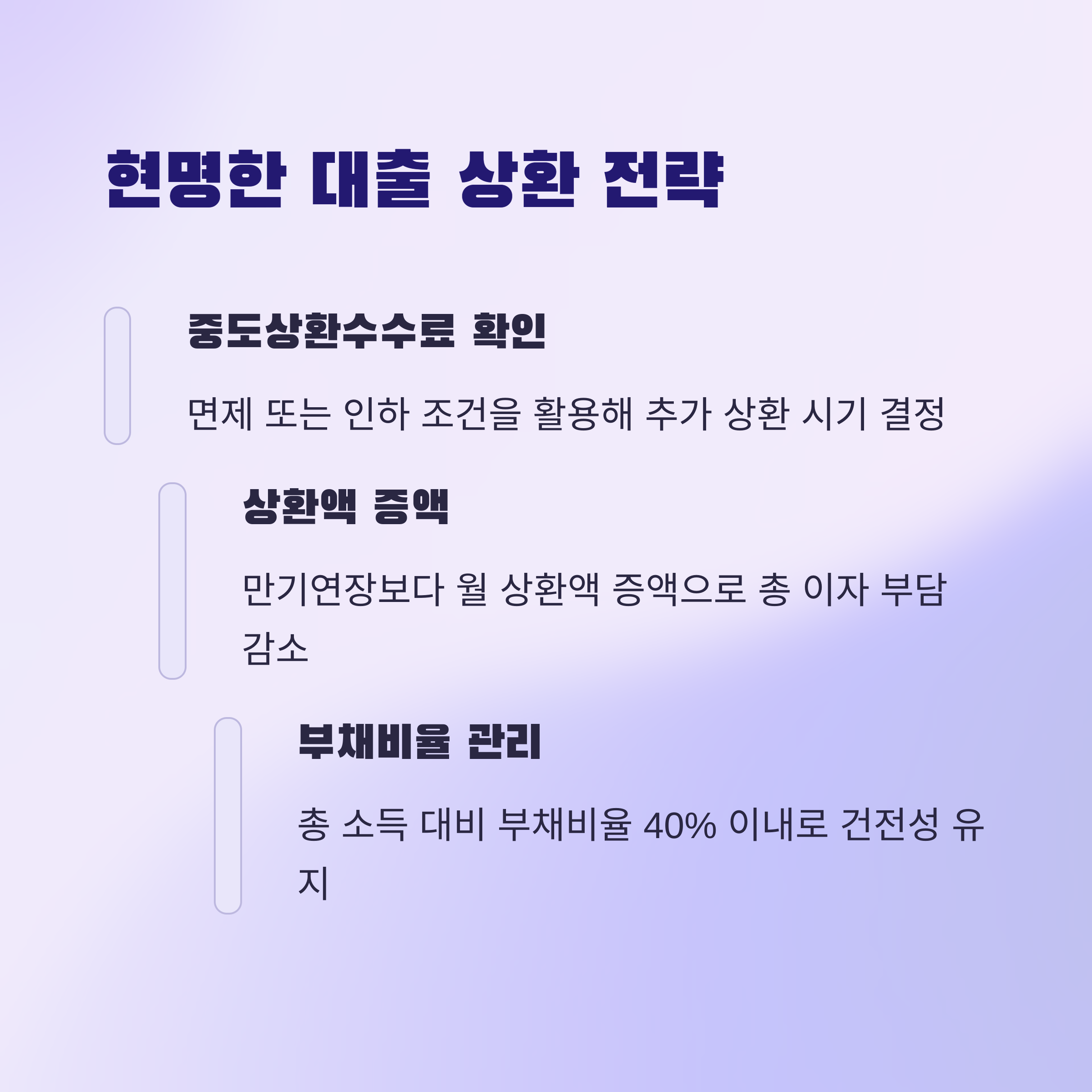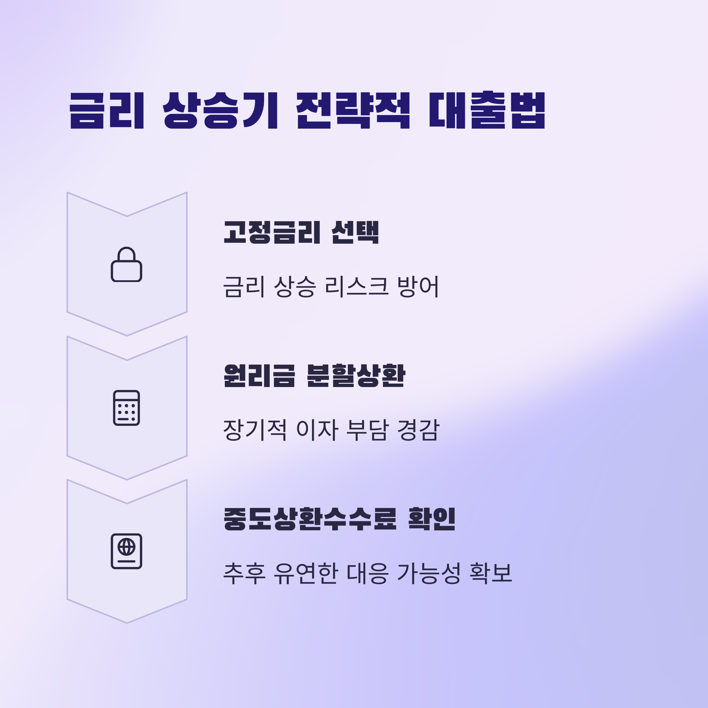 금리가 상승하기 전에 대출 상환 계획을 세워두는 것이 중요합니다. 금리가 상승하면 상환 부담이 커질 수 있기 때문에 상환액을 미리 예측하고, 추가로 상환 가능한 금액을 고려하여 계획을 세우세요. 상환 기간을 단축하거나 추가 상환을 통해 이자 부담을 줄일 수 있습니다. 또한, 금리가 오를 것으로 예상될 때는 고정 금리로의 전환도 고려해볼 수 있습니다.