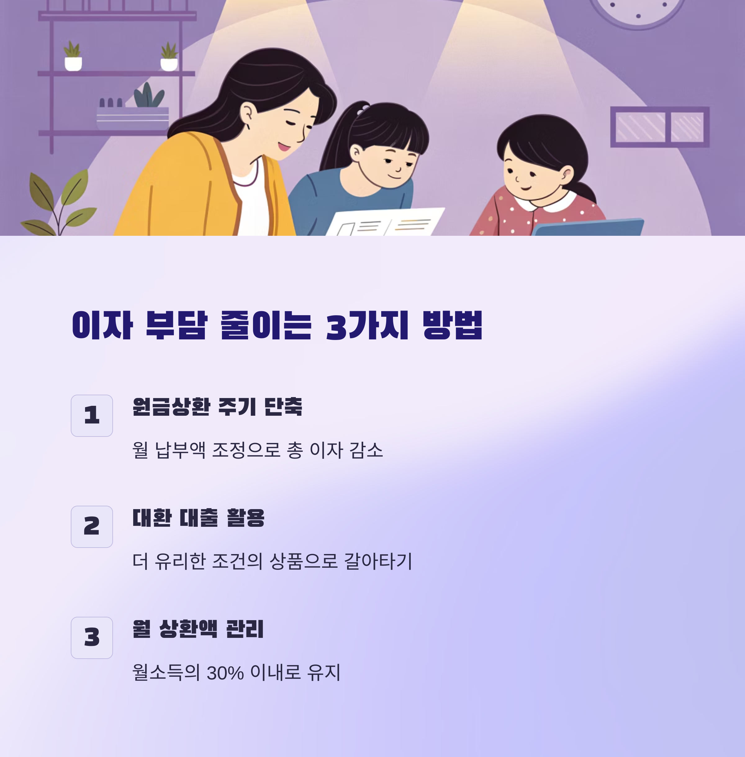 이자 부담을 관리하려면 상환 기간을 단축하거나 고정 금리로 대환 대출을 고려하는 것이 좋습니다. 금리가 상승하면, 기존의 대출을 고정 금리로 바꾸는 것도 좋은 방법입니다. 상환 계획을 철저히 세우고, 대출금의 일부를 추가로 상환하는 방법도 고려해보세요. 이를 통해 이자 부담을 줄일 수 있으며, 장기적으로 이익을 볼 수 있습니다. 금리가 상승하면 상환 계획을 재조정하는 것이 중요합니다.